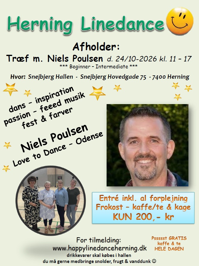 Niels Poulsen fra Love to Dance i Odense er på besøg hvert år, som gæsteinstruktør ved træf i Herning Linedance … Niels underviser til events i hele verden, laver kurser for både dansere og instruktører, og han koreograferer selv danse til stor glæde for hele linedance verdenen.. For mere info om Niels tryk hér – love-to-dance.dk